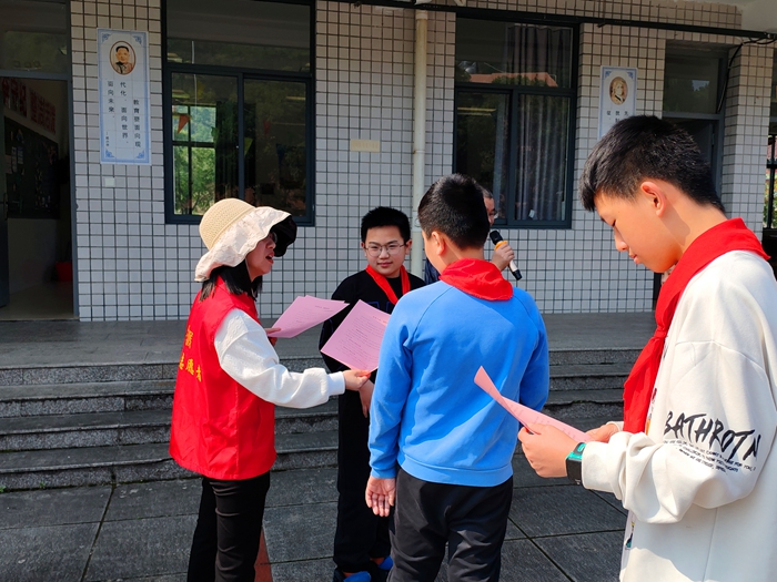 宣傳員向學生們發(fā)放防溺水倡議書,講解安全知識,守護生命安全。(洪洋鄉(xiāng)供圖)