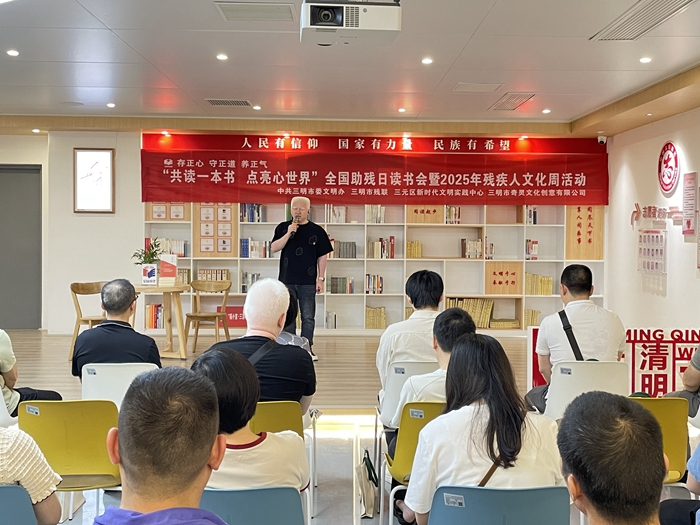 5月15日上午,中共三明市委文明辦、市殘聯(lián)在三元區(qū)新時(shí)代文明實(shí)踐中心聯(lián)合舉辦“共讀一本書 點(diǎn)亮心世界”全國助殘日讀書會(huì)暨殘疾人文化周活動(dòng)。三明市委文明辦、市殘聯(lián)干部、市區(qū)部分全國文明單位、市盲協(xié)、奇靈文化創(chuàng)意有限公司代表等,共計(jì)40余人攜手體驗(yàn)這場沉浸式書香之旅。