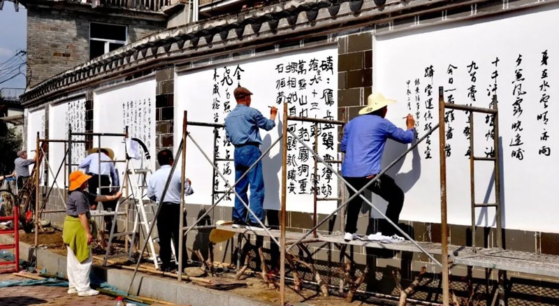 日前,順昌縣文聯(lián)組織縣書法家協(xié)會(huì)走進(jìn)中國(guó)歷史文化名鎮(zhèn)——元坑,開展“繪書法墻 助鄉(xiāng)村興”文藝志愿服務(wù)活動(dòng)。書法家們?cè)诟哌_(dá)3米多的圍墻上揮毫潑墨、揮汗疾書,一幅幅精彩的題壁書法在古老的墻面上徐徐展開,為古鎮(zhèn)元坑增添了一道亮麗的文化風(fēng)景。