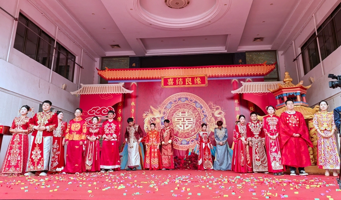 在頒證儀式現(xiàn)場(chǎng),精心布置的打卡點(diǎn),充分融入親情元素,倡導(dǎo)家庭參與,吸引了眾多親朋好友駐足,大家紛紛合影留念,記錄下這美好時(shí)刻。歡快的音樂(lè)與靈動(dòng)的節(jié)目表演相得益彰,點(diǎn)燃了現(xiàn)場(chǎng)活動(dòng)熱情。在浪漫溫馨的音樂(lè)聲中,新人們身著華服,手挽手入場(chǎng),在親朋好友的見(jiàn)證下,新人們集體宣讀《結(jié)婚誓言》,并許下了一生愛(ài)的承諾。特邀嘉賓為10對(duì)新人頒發(fā)結(jié)婚證及紀(jì)念品,送上美好祝福。接著新人們共同宣讀文明婚俗倡議書(shū),倡導(dǎo)簡(jiǎn)約適度、文明健康的婚俗理念,反對(duì)鋪張浪費(fèi)、大操大辦等不良風(fēng)氣,營(yíng)造文明、節(jié)儉、和諧的婚嫁新風(fēng)尚。