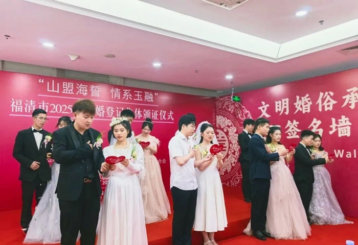 5月20日上午,福清市首屆“山盟海誓 情系玉融”結(jié)婚登記集體頒證活動在福清市政務(wù)服務(wù)中心二樓溫馨舉行,8對新人攜手步入婚姻殿堂,開啟人生新篇章。