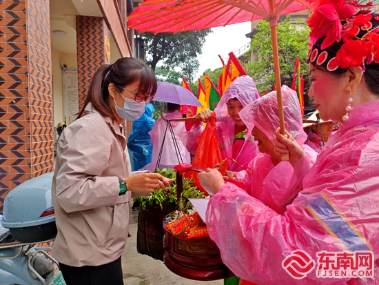 雖然天空下著雨,現(xiàn)場仍十分熱鬧。200多人的巡游隊伍穿著雨衣、拿著雨傘,途經江濱北路、富美宮、萬壽路、天后宮、德濟門遺址廣場,一路上載歌載舞,沿街噴灑雄黃酒。沿途不少商戶、住戶在門口設下“香案”,歡迎采蓮隊伍入內“采蓮”;隊伍中的人員會向商家、居民分發(fā)榕枝、艾草及香囊,收到祝福的人也會回贈紅包以表謝意。
