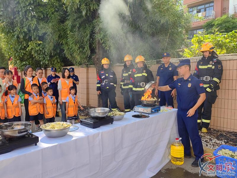 油鍋著火后,消防員演示用蔬菜滅火(夏菁 攝)
