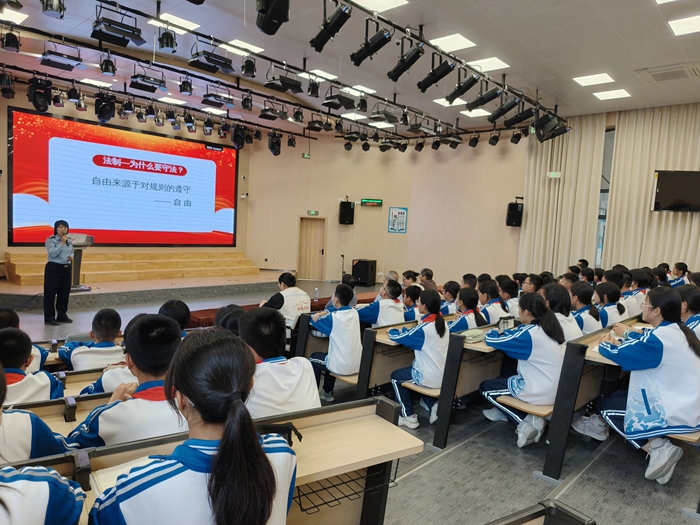 鼓西派出所游丹虹警官圍繞相關(guān)法律法規(guī)等,結(jié)合校園霸凌、網(wǎng)絡(luò)安全等典型案例,通過情景模擬與法律條文解析,為在場學(xué)生上了一堂生動的法治課。她著重講解如何應(yīng)對校園欺凌、分辨網(wǎng)絡(luò)風(fēng)險,強調(diào)“保護(hù)自身安全是第一準(zhǔn)則”,引導(dǎo)青少年增強法治意識與自我保護(hù)能力。