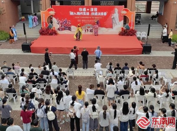 傍晚,文十番演奏、車鼓表演、舞獅表演輪番登場,非遺代表性傳承人共同為學(xué)院師生呈現(xiàn)一臺綜合性的文藝表演“大餐”。而在演出舞臺正對面,哆頭土筍凍、戴氏綠豆餅、新縣方糕、大洋林氏麥芽糖、豆?jié){炒各類非遺小吃吸引許多師生圍觀。特別是“老顏的鮑魚餛飩”攤位格外火爆,攤主是一個年輕小伙子,他一邊與學(xué)生交流,一邊現(xiàn)場直播,吸引許多大學(xué)生前來“打卡”,“融入現(xiàn)代生活——非遺正青春”在這個小攤位上具象化了。