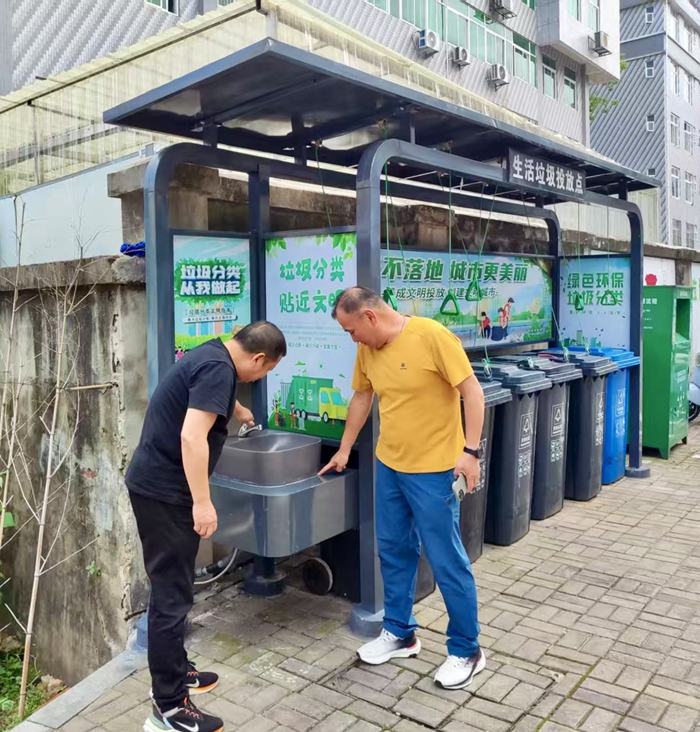 新型垃圾分類亭充分融入了“以人為本”的理念,著眼于提升居民投放垃圾的實(shí)際體驗(yàn)。除了具備堅(jiān)固耐用、易于清潔的特性外,最大便民亮點(diǎn)在于增設(shè)了按壓式洗手池,解決了居民投放垃圾后手部清潔的難題,讓垃圾分類投放過程更加便捷衛(wèi)生。