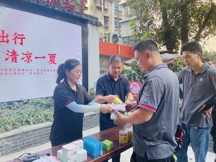 工作人員發(fā)放“慈善清涼禮包” 。鼓東街道 供圖