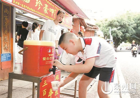 “頭一次見到這么多愛心奉茶點(diǎn),點(diǎn)贊!”在鯉城區(qū)西街舊館驛巷口一愛心奉茶點(diǎn)處,來自北京的李女士為泉州市區(qū)隨處可見的愛心奉茶點(diǎn)連連點(diǎn)贊。她覺得這些奉茶點(diǎn)不僅讓游客在炎炎夏日中感受到了清涼,也體現(xiàn)了城市的文明和愛心。