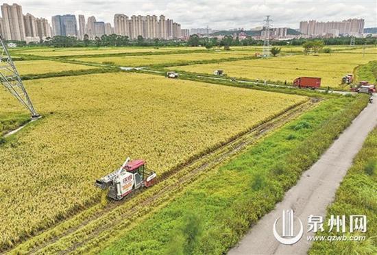 近期,泉州市早稻陸續(xù)迎來收割季。昨日,記者在晉江九十九溪田園風(fēng)光拓展區(qū)看到,多臺收割機正在稻田里來回穿梭,伴隨著轟隆隆的聲響,谷粒隨著轉(zhuǎn)軸轉(zhuǎn)動而脫落,填滿車廂。今年九十九溪田園風(fēng)光拓展區(qū)的早稻種植面積達(dá)到1800多畝,預(yù)計總產(chǎn)量可突破180萬斤。 (融媒體記者許雅玲 林勁峰 攝)