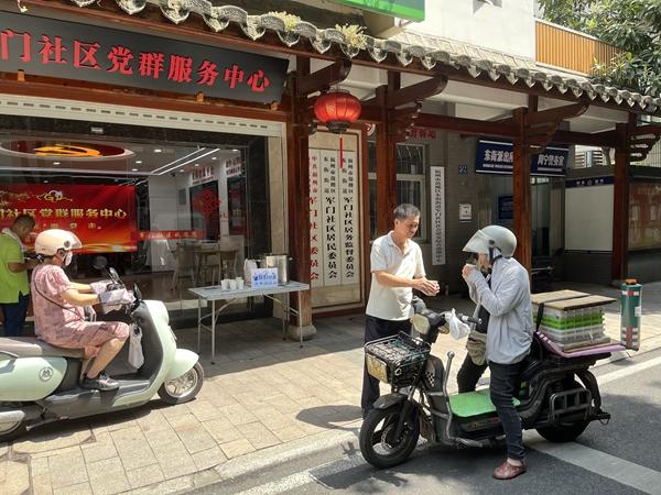 社區(qū)工作人員為外賣員送茶。東街街道 供圖