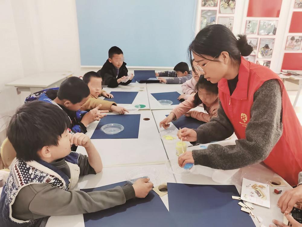 長(zhǎng)泰區(qū)志愿者陪伴困境兒童做手工。