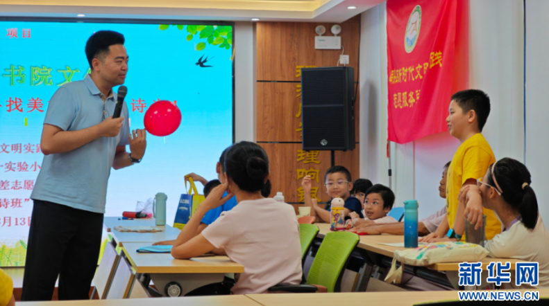 同安區(qū)舉辦的“文明實踐+書院文化 遇見兒童詩”文明實踐活動上,一名老師在與孩子們互動。新華網(wǎng) 劉默涵 攝