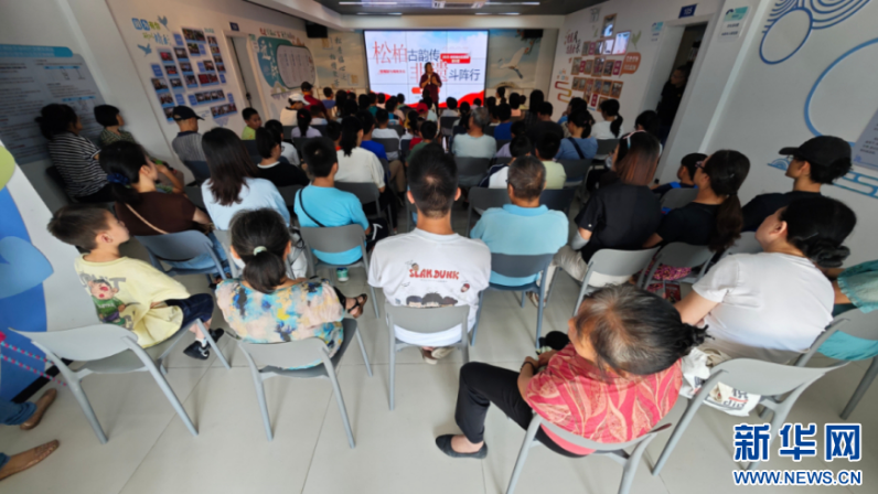 松柏社區(qū)新時代文明實踐站里,社區(qū)居民聆聽非遺講座。新華網(wǎng) 劉默涵 攝