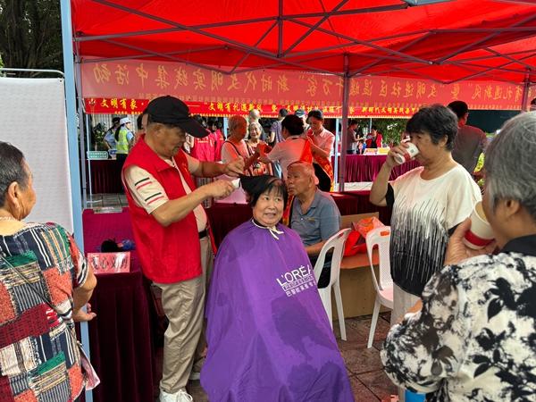 “依姆,您好,先喝一杯水,休息一下?!敝驹刚咭龑?dǎo)社區(qū)居民有序排隊(duì),等待免費(fèi)理發(fā)。