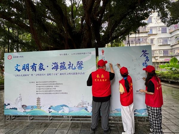 志愿者在文明承諾簽名墻簽名。長(zhǎng)樂區(qū)委宣傳部(文明辦) 供圖