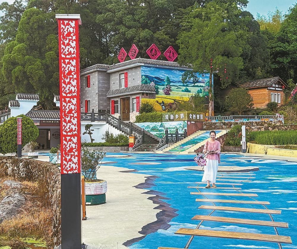 游客漫步靴嶺尾村,感受濃濃剪紙文化氛圍。