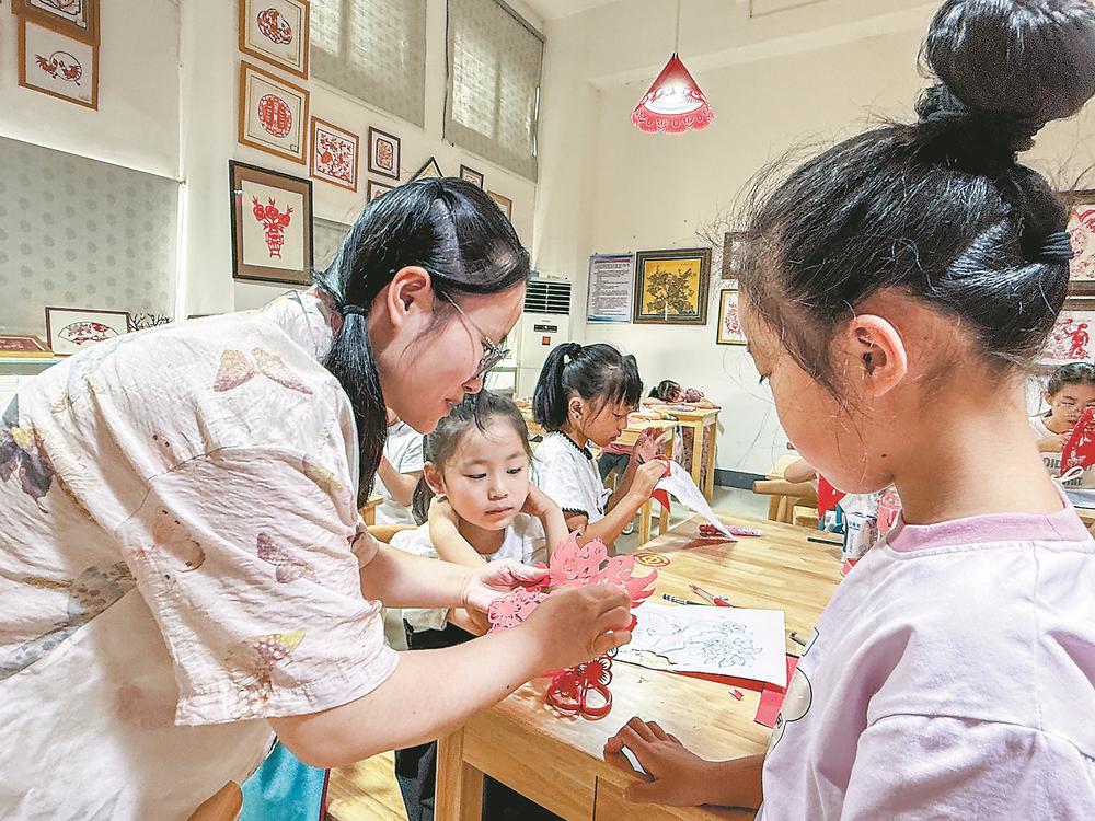 非遺代表性傳承人陳水云(左一)指導(dǎo)學(xué)生練習(xí)剪紙。