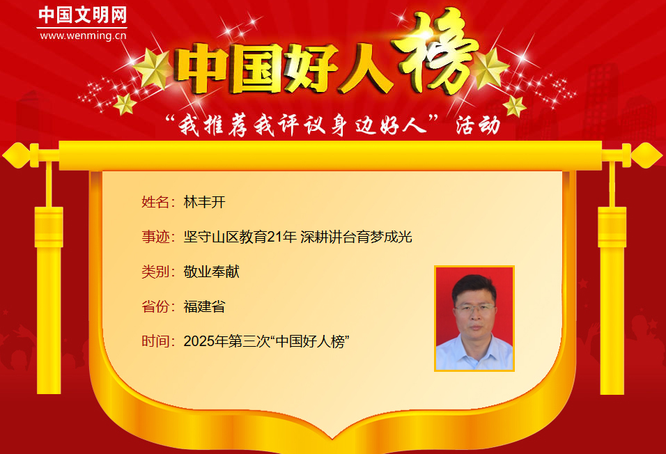 林豐開(kāi),男,1973年11月生,中共黨員,福建省泉州市永春美嶺中學(xué)高中生物學(xué)教師。他情系農(nóng)村教育,扎根山區(qū)精耕三尺講臺(tái)二十余年,以“讓山里孩子享有同等教育”的信念,在辦學(xué)條件艱苦、生源基礎(chǔ)薄弱的困境中辟路前行。他創(chuàng)新教學(xué)方式喚醒課堂活力,以一年多堅(jiān)持單程近500公里的奔波,堅(jiān)守“不缺一節(jié)課”的承諾。他用21年的執(zhí)著與堅(jiān)韌,培育100余名反哺鄉(xiāng)村人才,書寫了山區(qū)教師的奉獻(xiàn)之歌。林豐開(kāi)曾獲全國(guó)優(yōu)秀教師、全國(guó)中小學(xué)優(yōu)秀班主任、福建省優(yōu)秀農(nóng)村教師等榮譽(yù)。