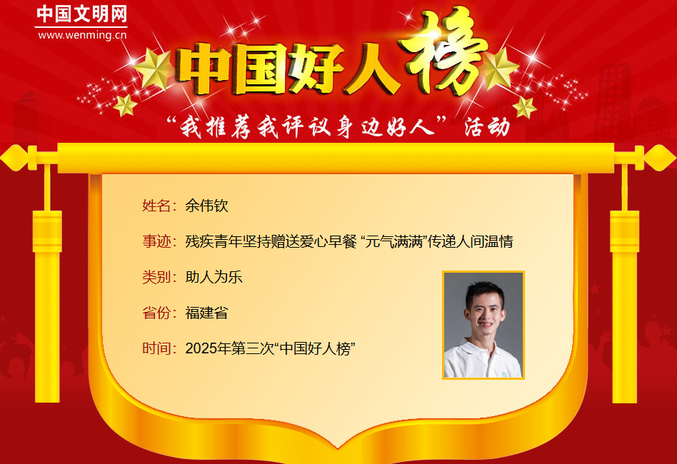 余偉欽,男,1993年9月生,福建省廈門市早龍?jiān)绮蛿倲傊?。作為一位后天性腦性癱瘓患者,余偉欽始終以積極樂(lè)觀的態(tài)度對(duì)待生活。他在自己早餐攤位上放了一塊牌子,上面寫著如果沒(méi)有收入或遇到困難,只要說(shuō)出“來(lái)份‘元?dú)鉂M滿早餐’”,就可以免費(fèi)打包帶走一份早餐。這個(gè)活動(dòng)從他開(kāi)始賣早餐就有了,因?yàn)樗约阂苍?jīng)挨過(guò)餓,所以希望能給他人幫助。他用“元?dú)鉂M滿的早餐”幫助暫時(shí)有困難的人,傳遞著自己的善意,也傳遞著城市的溫暖。