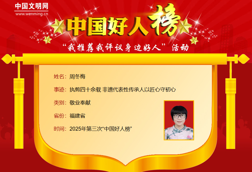 周冬梅,女,1967年11月生,中共黨員,福建省南平市浦城縣圖書館高級(jí)工藝美術(shù)師、國(guó)家級(jí)非物質(zhì)文化遺產(chǎn)浦城剪紙國(guó)家級(jí)代表性傳承人。周冬梅投身剪紙藝術(shù)領(lǐng)域已有四十多年,她把自己畢生的心血都傾注在了非遺的保護(hù)傳承以及創(chuàng)新發(fā)展工作當(dāng)中。她帶領(lǐng)團(tuán)隊(duì)成功打造了“剪花嫂”等品牌,還開(kāi)發(fā)出一系列深受市場(chǎng)歡迎的非遺文創(chuàng)衍生產(chǎn)品。在技藝方面,她對(duì)剪紙傳統(tǒng)手工技法加以改良,首創(chuàng)使用眼科手術(shù)剪進(jìn)行剪紙創(chuàng)作,使得剪紙的圖案花紋更加細(xì)膩精美,這一創(chuàng)新也助力浦城剪紙非遺技藝走向國(guó)際,走出國(guó)門。此外,她還熱心公益事業(yè),長(zhǎng)期堅(jiān)持免費(fèi)帶徒授藝,在她和團(tuán)隊(duì)的共同努力下,團(tuán)隊(duì)獲評(píng)福建省“最佳志愿服務(wù)組織”。周冬梅曾獲全國(guó)三八紅旗手、全國(guó)古籍保護(hù)工作先進(jìn)個(gè)人、福建省鄉(xiāng)村工匠名師等榮譽(yù)。
