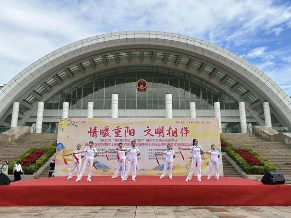 活動在民樂演奏《暖山》悠揚的樂聲中拉開帷幕,隨后,手勢舞《孝為先》以輕盈舞姿勾勒“百善孝為先”的傳統(tǒng)內核,讓敬老理念可視化;歌曲《萱草花》用溫柔歌聲訴說牽掛,喚起現(xiàn)場觀眾對長輩的感恩之情;柔力球表演《我祝祖國三杯酒》、太極功夫扇表演《扇韻展新風》則將健康生活理念與傳統(tǒng)文化韻味相結合,展現(xiàn)長者風采與時代活力。緊接著,朗誦《文明榕城,情暖重陽》、福州語歌曲《礱礱榖,榖礱礱》、移風易俗快板《厚養(yǎng)薄葬新篇章》用多樣的表演形式,傳遞文明理念,倡樹時代新風;最后,舞蹈《醉花間》、歌曲《萬事如意》,寄托了對長輩的祝福和對美好生活的向往。