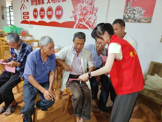 志愿者在愛心食堂宣傳村規(guī)民約。泉州文明網(wǎng) 供圖