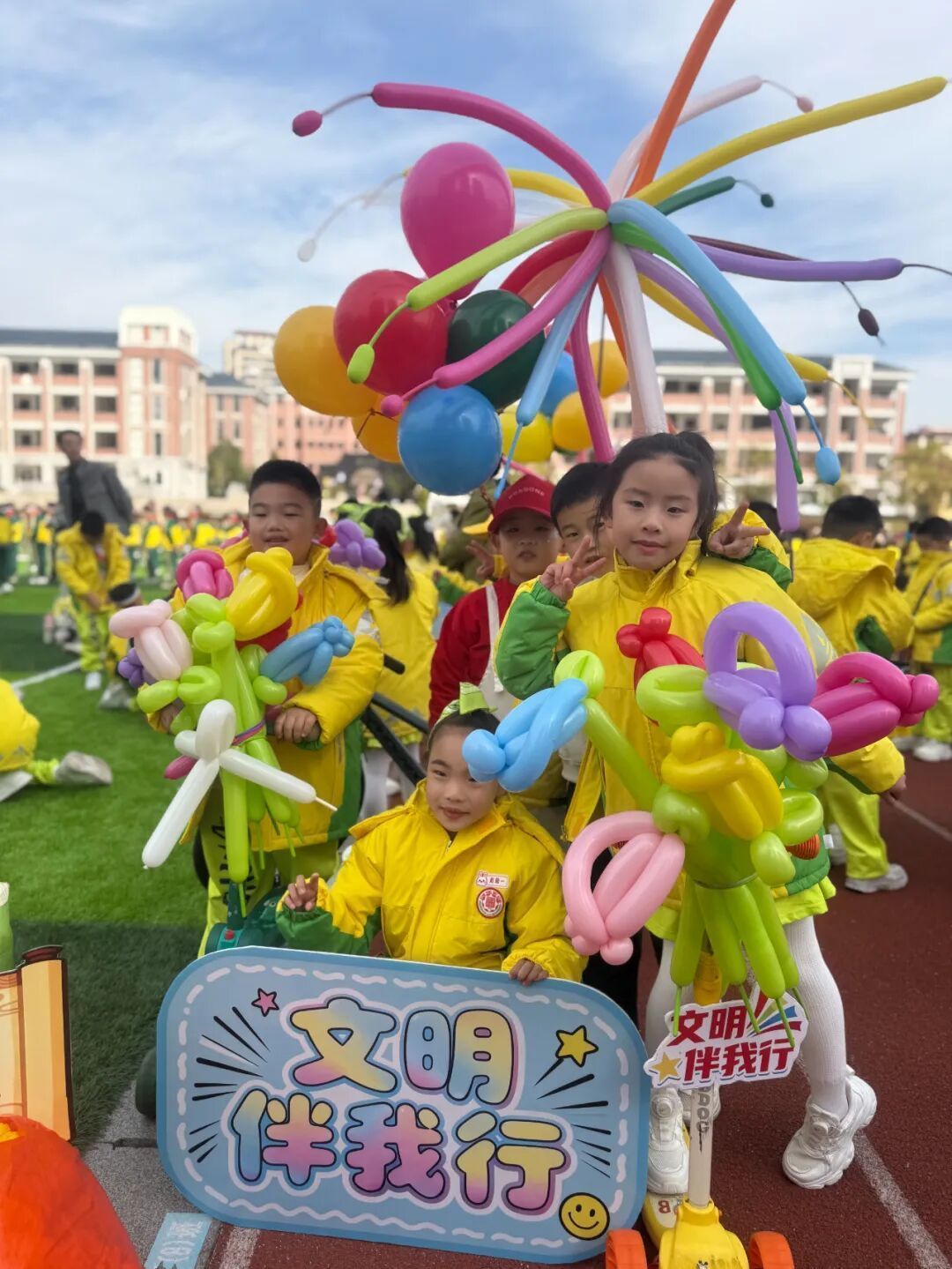 伴隨著《運(yùn)動(dòng)員進(jìn)行曲》的激昂旋律,文明實(shí)踐入場(chǎng)儀式正式開(kāi)啟。莊嚴(yán)的國(guó)旗隊(duì)率先登場(chǎng),鮮紅國(guó)旗迎風(fēng)招展,彰顯著新時(shí)代少年的愛(ài)國(guó)情懷;承載活動(dòng)主題愿景的會(huì)徽隊(duì)緊隨其后,穩(wěn)步前行。各年段代表隊(duì)依次亮相,將創(chuàng)意與文明內(nèi)涵深度融合:或持彩旗展現(xiàn)蓬勃生機(jī),或喊文明口號(hào)彰顯奮進(jìn)姿態(tài),或化身“超級(jí)馬里奧”傳遞童真活力,或演繹復(fù)古舞蹈展現(xiàn)文化韻味……全校隊(duì)伍精神飽滿、風(fēng)貌昂揚(yáng),每一個(gè)創(chuàng)意設(shè)計(jì)、每一次整齊步伐,都展現(xiàn)著實(shí)小學(xué)子的活力風(fēng)采與文明素養(yǎng),贏得現(xiàn)場(chǎng)陣陣掌聲。