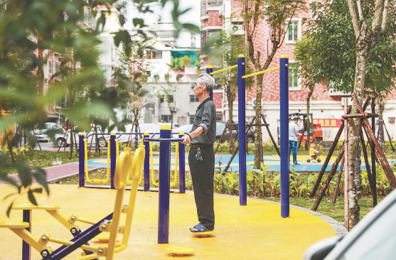 經(jīng)過精細(xì)化改造后煥然一新,成為集兒童游樂、體育健身、休閑漫步于一體的社區(qū)小公園,昔日“臟亂差”的角落如今充滿市民的歡聲笑語,成為城市微更新項(xiàng)目的又一成功范例。色彩明快的塑膠地墊取代了曾經(jīng)的碎石黃土,嶄新的兒童游樂區(qū)內(nèi),排列著滑梯等娛樂設(shè)施。