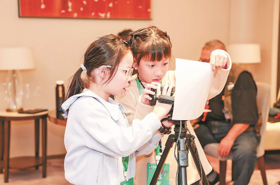 參與活動(dòng)的小學(xué)生在學(xué)習(xí)攝像機(jī)使用技巧。方晨穎 攝