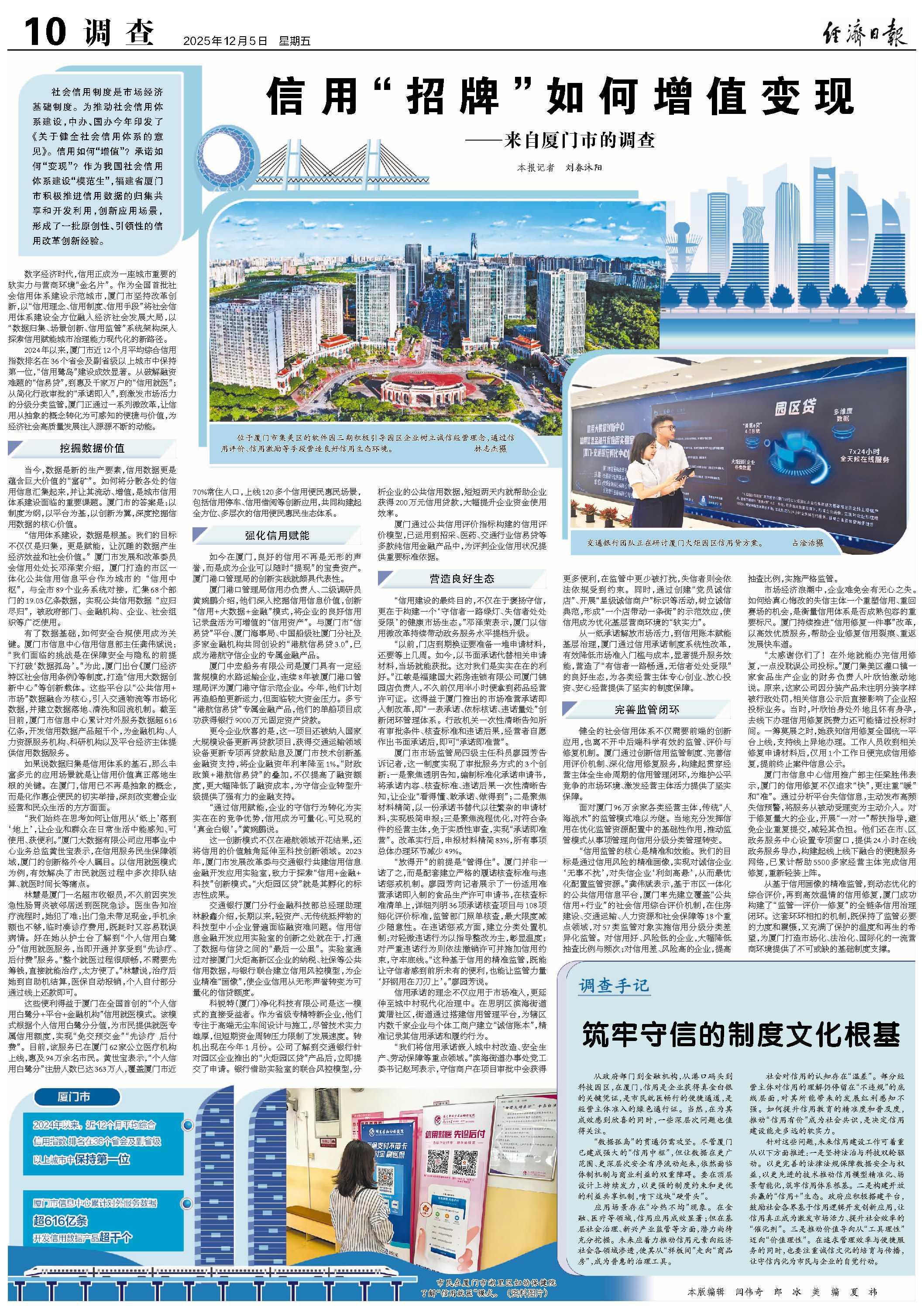 2024年以來(lái),廈門(mén)市近12個(gè)月平均綜合信用指數(shù)排名在36個(gè)省會(huì)及副省級(jí)以上城市中保持第一位,“信用鷺島”建設(shè)成效顯著。從破解融資難題的“信易貸”,到惠及千家萬(wàn)戶的“信用就醫(yī)”;從簡(jiǎn)化行政審批的“承諾即入”,到激發(fā)市場(chǎng)活力的分級(jí)分類監(jiān)管,廈門(mén)正通過(guò)一系列微改革,讓信用從抽象的概念轉(zhuǎn)化為可感知的便捷與價(jià)值,為經(jīng)濟(jì)社會(huì)高質(zhì)量發(fā)展注入源源不斷的動(dòng)能。