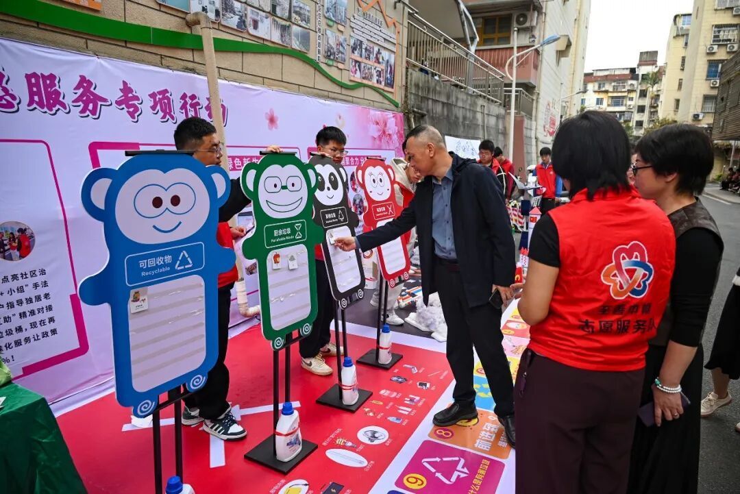 現(xiàn)場設(shè)置五大互動板塊,將垃圾分類知識融入趣味游戲。廢物制作科技展區(qū)內(nèi),親子手工作品讓人眼前一亮,孩子們用廢舊紙箱、塑料瓶制作的小機(jī)器人、花瓶等創(chuàng)意作品吸引居民駐足,還有垃圾卡片分類挑戰(zhàn)、幸運(yùn)大轉(zhuǎn)盤問答、分類標(biāo)識套圈等游戲,讓大家在輕松玩樂中熟練掌握分類技能。一位參與活動的家長表示:“孩子邊玩邊學(xué),還主動教我分類,這樣的活動比單純說教有效多了!”