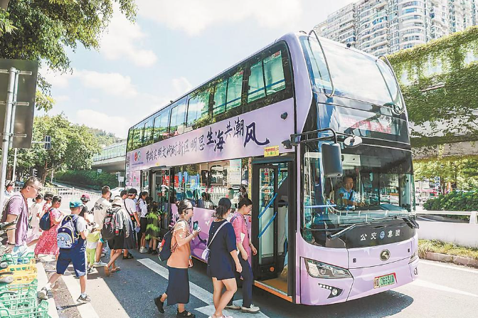 市民乘坐思明區(qū)文明實(shí)踐主題巴士打卡體驗(yàn)實(shí)踐帶。(思明區(qū)委文明辦供圖)