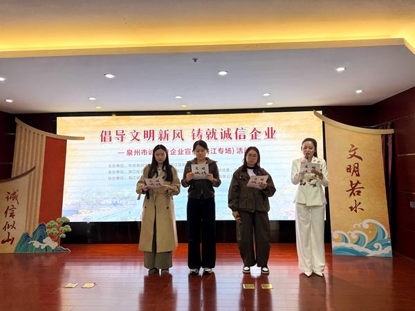 12月9日,“倡導(dǎo)文明新風(fēng) 鑄就誠信企業(yè)”泉州市誠信進(jìn)企業(yè)宣傳(洛江專場)舉行?;顒又荚谏钊雽W(xué)習(xí)宣傳貫徹黨的二十屆四中全會精神和習(xí)近平總書記關(guān)于誠信建設(shè)的重要論述,弘揚(yáng)誠信文化,提升企業(yè)及員工的文明素養(yǎng)和誠信意識,營造“知信、用信、守信”的良好營商環(huán)境。