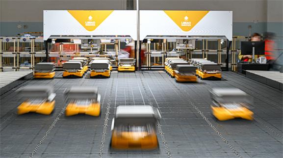 在兩岸跨境電商園3號倉,分揀機(jī)器人正忙著分裝貨物。江信恒 攝