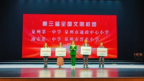 活動(dòng)伊始,舉行了第三屆全國(guó)文明校園頒牌儀式。市領(lǐng)導(dǎo)莊燦霞分別為泉州第一中學(xué)、南安第一中學(xué)、泉州市通政中心小學(xué)、泉州市晉光小學(xué)等學(xué)校頒發(fā)榮譽(yù)牌匾。