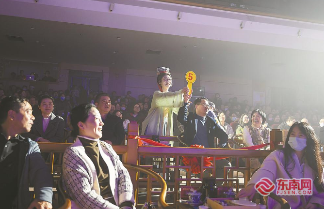 “茶要有骨氣,人更要有!”25日晚8時(shí),福州評(píng)話伬藝傳習(xí)所內(nèi),茶香彌漫。千年時(shí)光在這里仿佛濃縮成一瞬,全場(chǎng)觀眾共赴一場(chǎng)宋韻新譯、茶香裊裊的有福之旅。