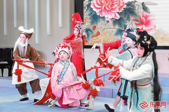 來自泉州市新隅小學(xué)的陳詩豪與同學(xué)們帶來了高甲戲表演《鬧花轎》,作為公子丑的扮演者,詼諧俏皮的表演風(fēng)格引得現(xiàn)場觀眾歡笑聲連連。他從三年級起在學(xué)校少年宮學(xué)習(xí)高甲戲表演,因為覺得表演有意思,他越學(xué)越喜歡、越學(xué)越開心。