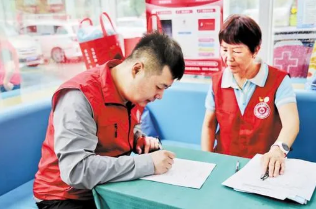 陸浩(左)在捐獻(xiàn)血小板前進(jìn)行登記。受訪者供圖