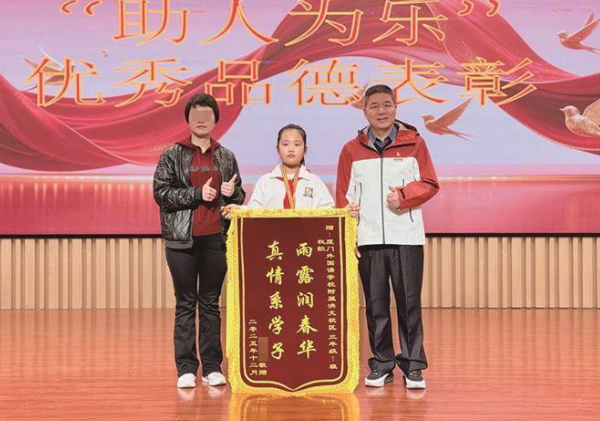 商鋪老板娘突然暈倒,小學(xué)生發(fā)現(xiàn)后冷靜應(yīng)對,助其脫險。1月12日,在廈門外國語學(xué)校附屬小學(xué)洪文校區(qū)的升旗儀式上,三年(1)班女生權(quán)歆因?yàn)樽约旱呐闹酥e,收獲了一面錦旗和一枚“金牌”。