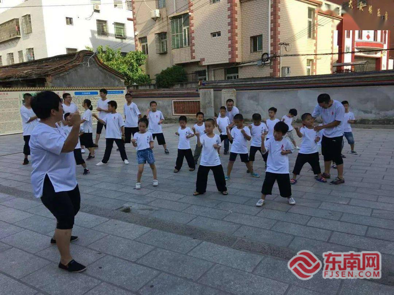 邱婧娜帶著本地孩童與外來務(wù)工人員子女一同扎馬步、練拳法。海滄區(qū)委文明辦 供圖