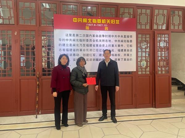 在中共閩北臨時委員會舊址紀念館內(nèi),吳孔盛與沙無濘親切交談,仔細詢問她的身體狀況和生活情況,對她幾十年如一日守護革命舊址、義務(wù)講解紅色歷史的奉獻精神表示高度贊揚。