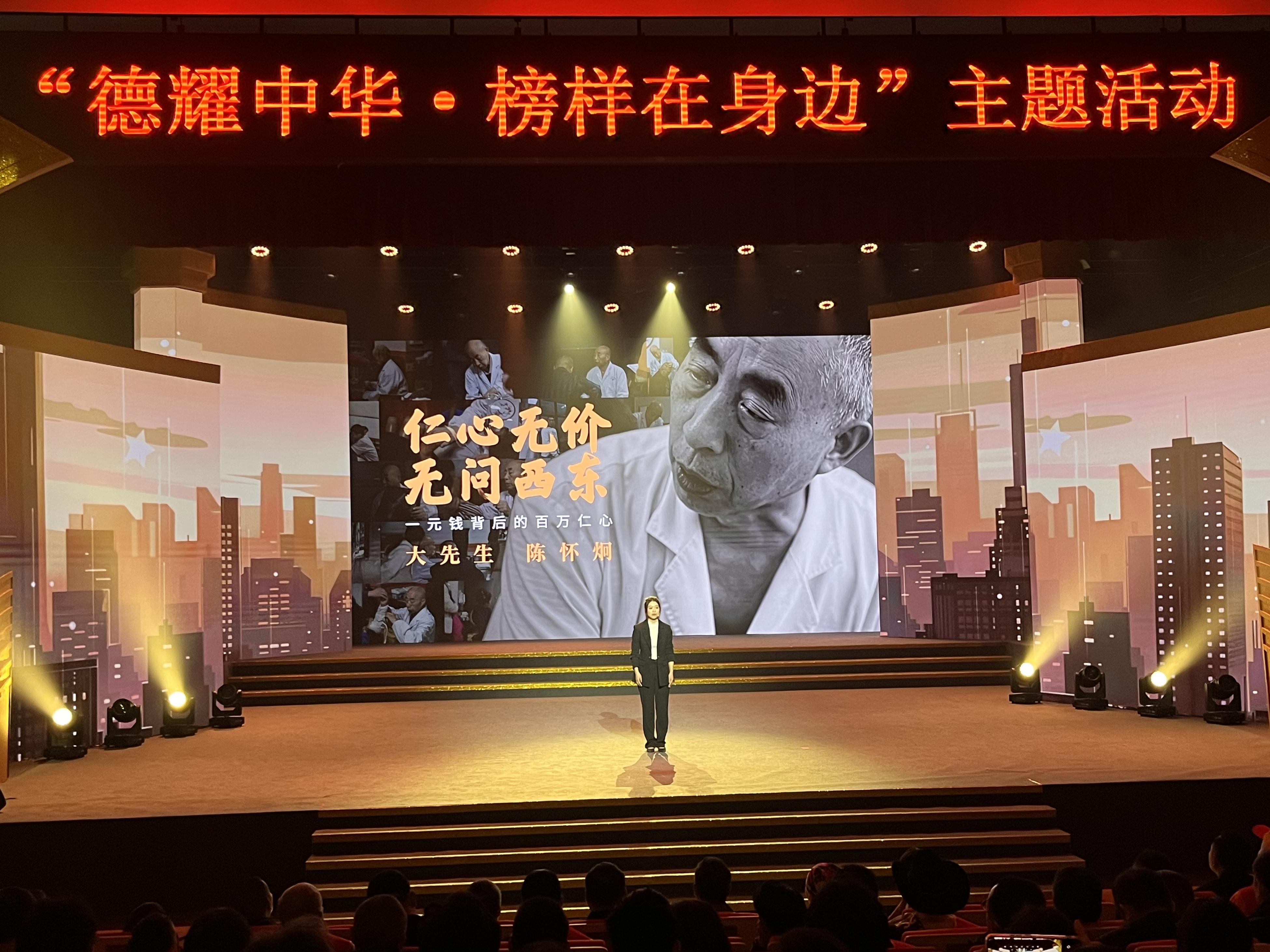 道德模范是全社會(huì)的價(jià)值標(biāo)桿,他們的事跡溫暖人心、感動(dòng)中國(guó)。開展“德耀中華·榜樣在身邊”主題活動(dòng),通過(guò)與群眾面對(duì)面交流等,傳播道德模范的嘉言懿行,解讀他們的精神世界,傳遞他們的榜樣力量?;顒?dòng)現(xiàn)場(chǎng),情景小品《一動(dòng)一靜,守護(hù)黃山之巔》生動(dòng)講述黃山風(fēng)景區(qū)普通工人李培生、胡曉春用心用情守護(hù)美麗黃山的故事,讓觀眾深受打動(dòng)。新疆維吾爾自治區(qū)烏恰縣吉根鄉(xiāng)護(hù)邊員布茹瑪汗·毛勒朵60年如一日在海拔5000米的高山之上,踩出20多萬(wàn)公里的巡邊足跡,沿著邊境線刻下10多萬(wàn)塊“中國(guó)石”。紀(jì)實(shí)影像《帕米爾高原上的“中國(guó)石”》,充分展現(xiàn)了她的擔(dān)當(dāng)堅(jiān)守。四川省天全縣中醫(yī)院原院長(zhǎng)陳懷炯,堅(jiān)持1元掛號(hào)、3元膏藥的診療費(fèi)用,并將祖?zhèn)髟\所、獨(dú)門秘方無(wú)償捐給國(guó)家?!度市臒o(wú)價(jià)·無(wú)問(wèn)西東》以記者的視角講述他的醫(yī)者仁心,獲得觀眾們點(diǎn)贊致敬?!斑@封信,是穿越時(shí)空的文明接力棒,是連通昨天和明天的精神誓言”,道德模范與青年學(xué)生一起朗誦《寫給未來(lái)的信》,表達(dá)書寫更多道德故事的心聲,讓臺(tái)上臺(tái)下產(chǎn)生強(qiáng)烈共鳴。