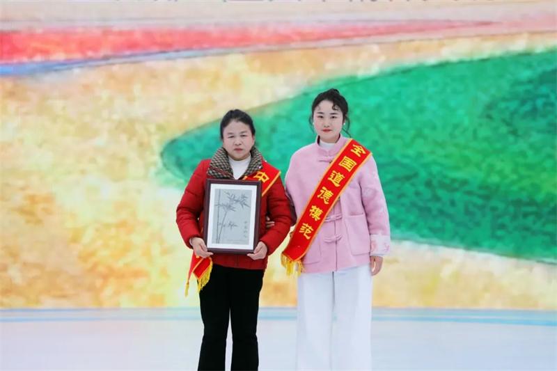 全國道德模范曹于亞(右)為中國好人李遇梅(左)贈送道德傳家寶。王楠 攝