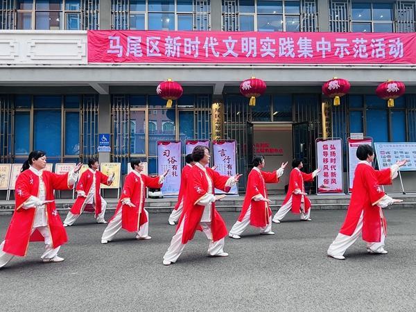 活動現(xiàn)場,喜慶的氛圍感染著每個人。兩馬一心太鼓隊率先登場,鼓聲激昂、振奮人心。緊接著,彩帶龍隊伍驚艷亮相,龍身翻飛盤旋,引來陣陣喝彩。太極拳展示動作舒緩剛?cè)幔宫F(xiàn)了老年群體的精神風貌。少年李睿濤表演的少林七星拳剛勁利落,也贏得了現(xiàn)場觀眾的掌聲。