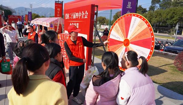 本次宣講活動采用了群眾喜聞樂見的“微宣講”形式,并探索了“宣講+文藝+服務+文創(chuàng)集市”的多元模式?,F場設置了黨的二十屆四中全會“金句盲盒”“全會精神大轉盤”等互動游戲體驗區(qū),吸引眾多居民踴躍參與。剛參加完互動的大學生志愿者興奮地表示:“這種寓教于樂的方式特別好,我在志愿服務中,也記住了很多全會金句。”