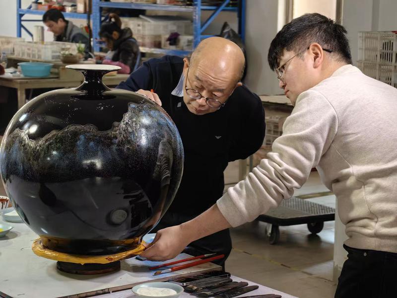 林劍軍(右)與臺灣導師黃寶賢一同創(chuàng)作瓷胎花瓶。