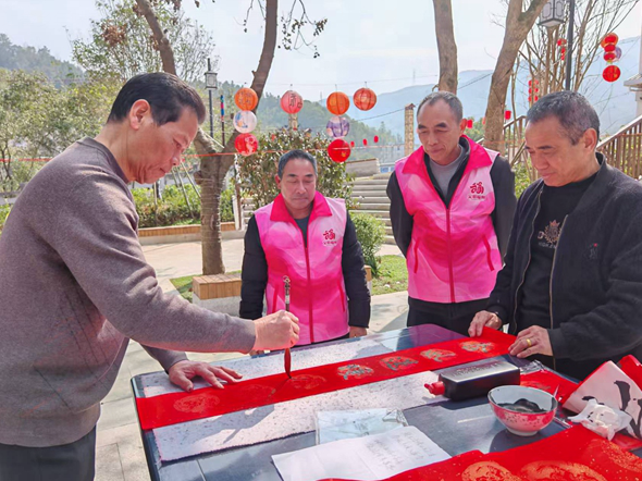 書法家揮毫寫春聯(lián)送祝福,鄉(xiāng)親圍聚年味濃。霍口畬族鄉(xiāng) 供圖