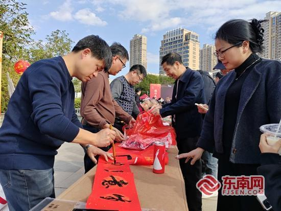 書法愛好者揮毫潑墨,將“文明”“平安”“反詐”等元素融入春聯(lián),把新春祝福與文明期許一并送到群眾手中。主辦方 供圖