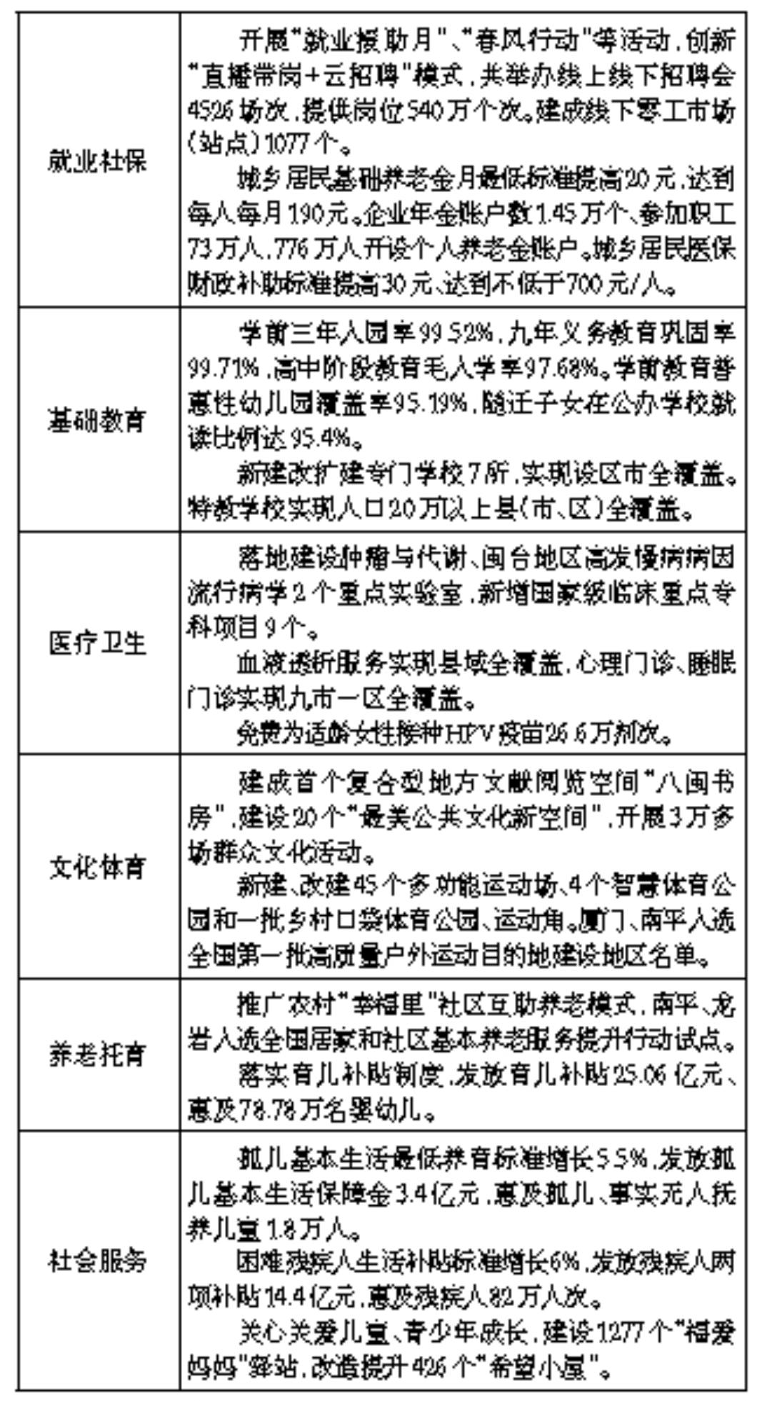 三是社會(huì)保障更加有力。漸進(jìn)式延遲法定退休年齡改革有序推進(jìn),基本養(yǎng)老保險(xiǎn)待遇穩(wěn)步提高,惠及262萬(wàn)退休職工。上調(diào)城鄉(xiāng)居民基礎(chǔ)養(yǎng)老金最低標(biāo)準(zhǔn),惠及586.56萬(wàn)老年城鄉(xiāng)居民?;攫B(yǎng)老保險(xiǎn)參保3475.13萬(wàn)人,其中,企業(yè)職工基本養(yǎng)老保險(xiǎn)參保1730.96萬(wàn)人。開(kāi)展新就業(yè)形態(tài)人員職業(yè)傷害保障試點(diǎn),職業(yè)傷害保障參保91.6萬(wàn)人。廈門(mén)、泉州、三明、龍巖入選全國(guó)基本醫(yī)療保險(xiǎn)參保長(zhǎng)效機(jī)制創(chuàng)新綜合試點(diǎn),全省基本醫(yī)保參保率穩(wěn)定在95%左右。深入開(kāi)展“八閩巾幗維權(quán)暖心行動(dòng)”,推動(dòng)出臺(tái)《福建省未成年人保護(hù)條例》。分層分類(lèi)實(shí)施救助幫扶,發(fā)放低保、特困、臨時(shí)救助等各類(lèi)救助資金61.7億元。關(guān)愛(ài)特殊困難群體,及時(shí)足額發(fā)放孤兒、殘疾人保障補(bǔ)貼資金。完善軍民融合、國(guó)防動(dòng)員、退役軍人服務(wù)保障等體系,全國(guó)雙擁模范城“滿堂紅”、“六連冠”目標(biāo)圓滿實(shí)現(xiàn)。