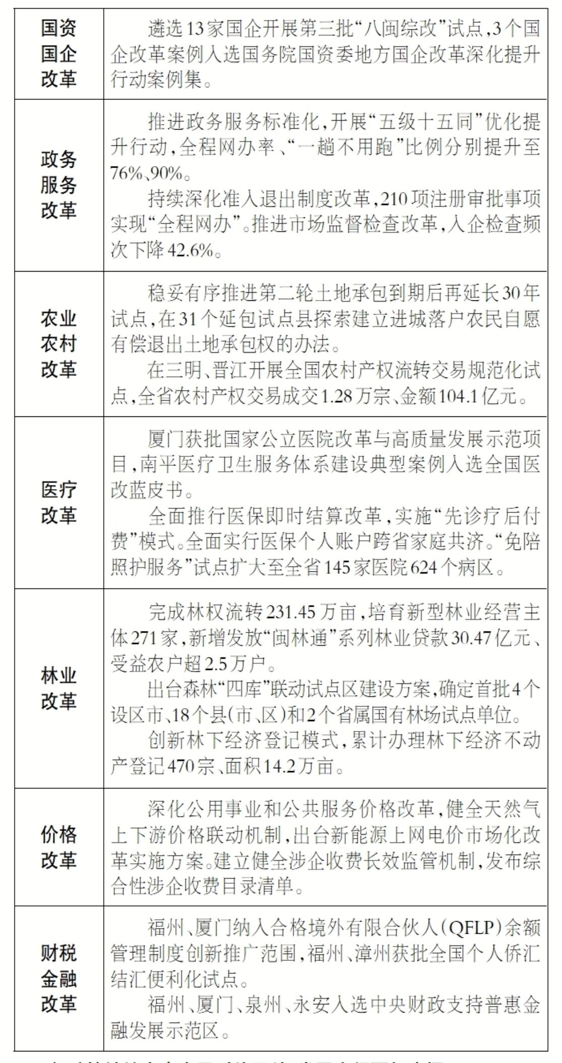 三是重點(diǎn)領(lǐng)域改革蹄疾步穩(wěn)。國(guó)企改革深化提升行動(dòng)圓滿收官,形成綜合改革試點(diǎn)企業(yè)74家,重組組建省工業(yè)控股集團(tuán)。印發(fā)實(shí)施貫徹落實(shí)《全國(guó)統(tǒng)一大市場(chǎng)建設(shè)指引(試行)》重點(diǎn)任務(wù)事項(xiàng)清單,深入開(kāi)展市場(chǎng)準(zhǔn)入壁壘清理整治行動(dòng),破除市場(chǎng)準(zhǔn)入壁壘126個(gè)。福廈泉要素市場(chǎng)化配置綜合改革試點(diǎn)獲國(guó)務(wù)院批復(fù)。福廈漳泉低效用地再開(kāi)發(fā)試點(diǎn)實(shí)施項(xiàng)目11.6萬(wàn)畝,三明、莆田、南平、寧德增列為試點(diǎn)城市?!扒鍐问健蓖茝V三明醫(yī)改經(jīng)驗(yàn),公立醫(yī)院綜合改革效果評(píng)價(jià)連續(xù)10年位居全國(guó)前列,率先在省級(jí)層面規(guī)范制發(fā)“福林票”,林長(zhǎng)制督查考核連續(xù)3年獲評(píng)優(yōu)秀等次,醫(yī)改、林改等福建特色改革經(jīng)驗(yàn)走向全國(guó)。